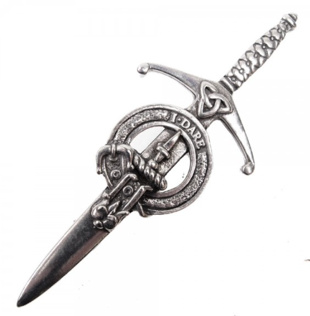 Your search for the perfect kilt accessory ends here! Introducing the Clan Crest Pewter Kilt Pin featuring the historic Dalziel Crest. This exquisite kilt pin stands out with its elegant broadsword design, enhanced by a stunning antique palladium finish that adds a touch of sophistication to any kilt ensemble.