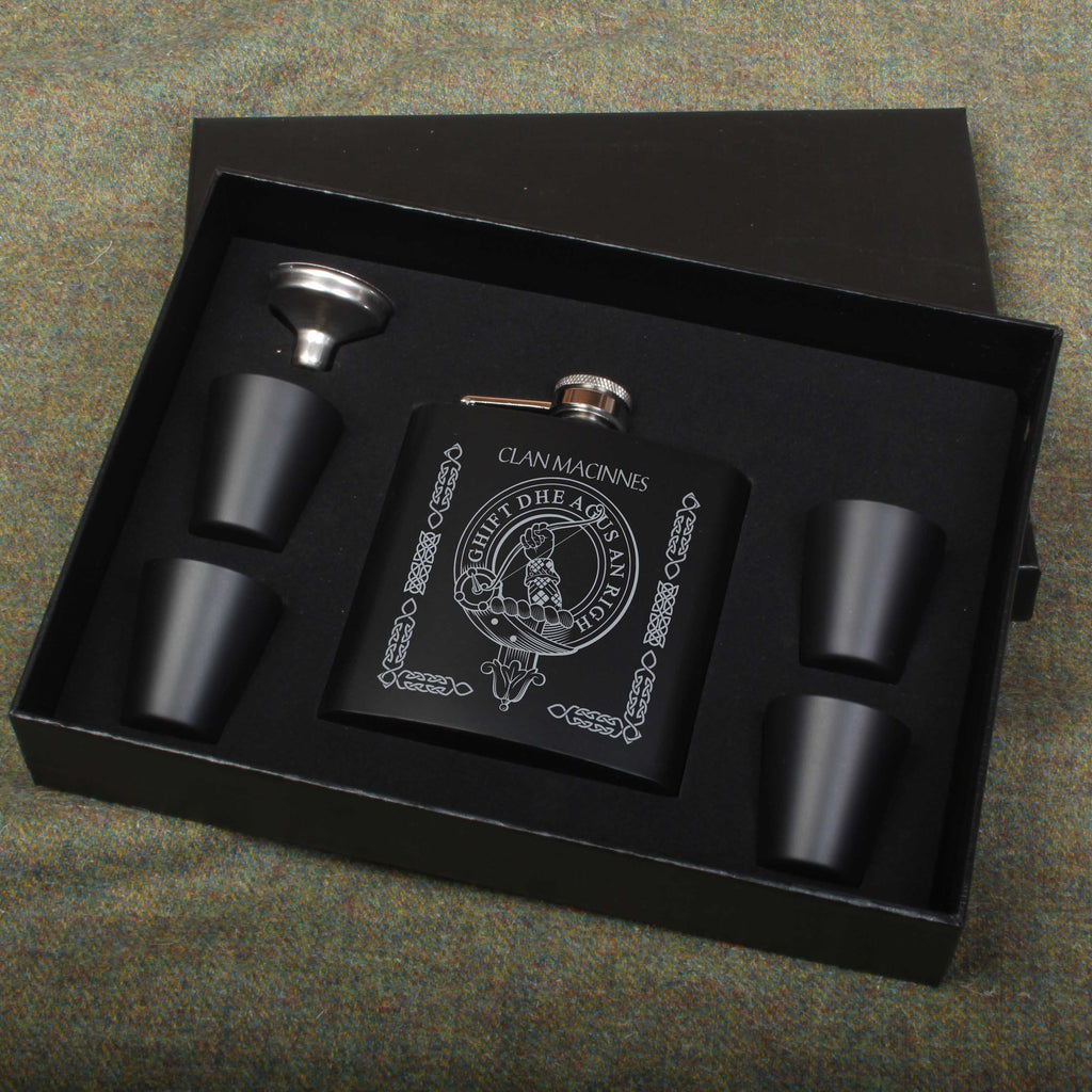Introducing the Clan Crest engraved 6oz Matt Black Hip Flask Gift Set with Cups and Funnel! This exceptional gift set is the perfect blend of style, durability, and convenience. Crafted from tough stainless steel, our classic 6oz matte black flask is designed to endure the test of time. It comes neatly packaged in a black gift box, complete with a steel pouring funnel and 4 cups.